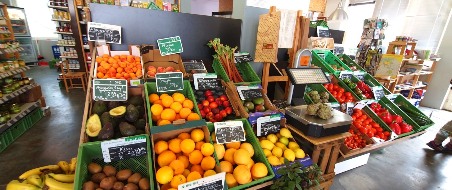 Gemüse, Obst, vegane Produkte, Eier, Milchprodukte, Fleisch, Wurst, Brot, Kuchen, Trockenfrüchte, Hülsenfrüchte, Getreide, Brotaufstriche, Teigwaren, Öle, Tee, Gewürze, Kaffee, Baby- und Kindernahrung, Getränke und vieles mehr.